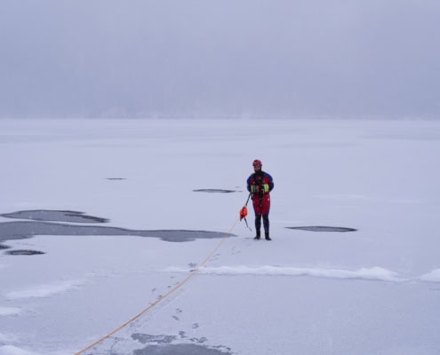 Vize-Vorstand Thomas Schaffarzyk erklärt mir, was im Ernstfall zählt. Wenn man selbst einbricht, ist das Wichtigste, Ruhe zu bewahren und zu versuchen, wieder aus dem Eis herauszukommen. Auf keinen Fall sollte man unter dem Eis tauchen. Der Weg zurück nach oben ist nicht mehr zu finden und lebensgefährlich. Siehst du, dass jemand ins Eis eingebrochen ist, gilt eine klare Regel. Abstand halten und sofort den Notruf über die 112 absetzen. Versuche niemals, selbst aufs Eis zu gehen, um jemanden zu retten. Die Gefahr einzubrechen, ist viel zu groß.