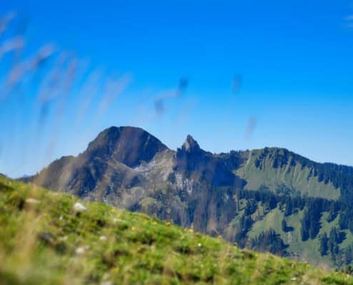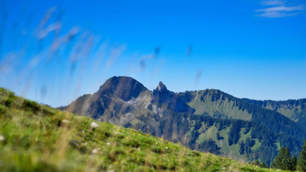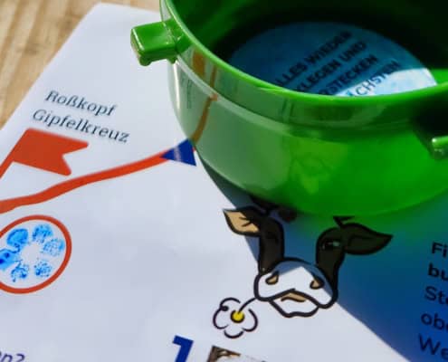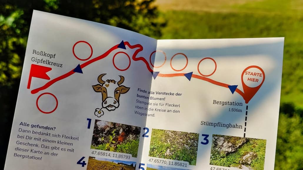 Entlang des Weges sind kleine grüne Geocache-Dosen versteckt, die ihr mit einer Schatzkarte suchen könnt. Die Karte gibt es an der Tal- und Bergstation. Zur Unterstützung sind Fotos und Koordinaten abgebildet, die euch näher an die richtige Stelle führen. In jeder Dose steckt ein Stempel, mit dem ihr eure Schatzkarte füllen könnt. So bleibt ihr immer wieder stehen, schaut genauer hin und entdeckt kleine Blumen und Pflanzen, die euch sonst vielleicht entgehen würden. Dieses Innehalten und genaue Hinschauen machen für mich den besonderen Reiz von Fleckerls Blumenweg aus. Oben am Roßkopf öffnet sich der Rundumblick auf die umliegenden Berge. Herrlich!