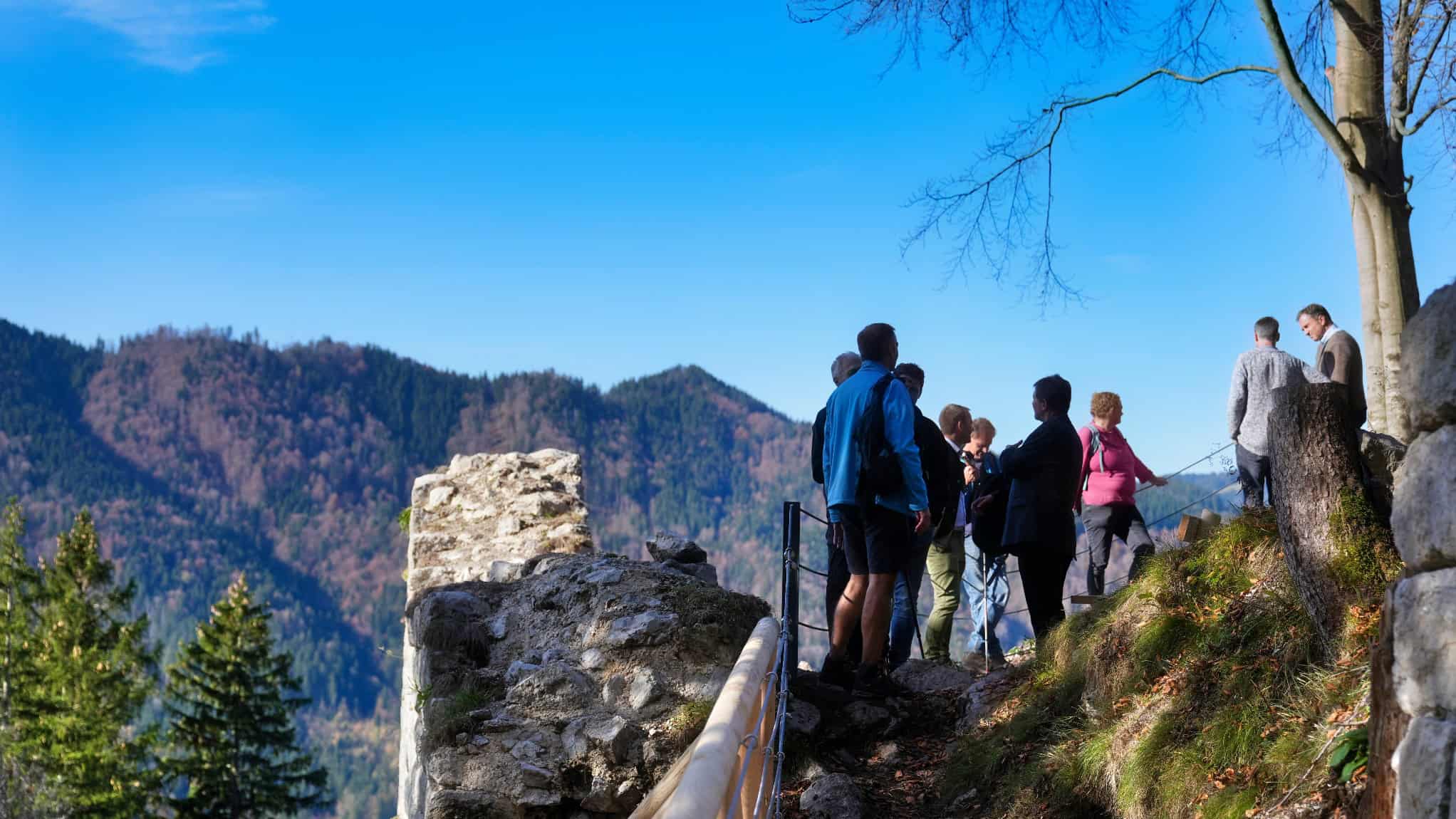 Starte am Unterleiten-Parkplatz und gehe über die Teerstraße zur Oberleiten und weiter über die Almwiesen in Richtung Hohenwaldeck. Ich bin erst nach Mittag unterwegs. Das ist erstmal kein Problem, da die Sonne herrlich die Almwiesen anleuchtet. Im Wald wird es schattig und der Pfad steigt stetig an, bevor er dann am Hang entlangführt. Du solltest hin und wieder stehen bleiben und zurückschauen, denn zwischen den Ästen blitzt immer wieder Schliersee durch. Dann erreichst du die Burgruine Hohenwaldeck. Sie wurde vor einem Jahr nach einer längeren Sanierungsphase wiedereröffnet und auch die Informations-Tafeln, die Geschichte erklären und Geschichten erzählen, stehen nun. Es ist spannend ein wenig in die Geschichte einzutauchen. Plötzlich zieht Nebel durch die Bäume. Die herrliche Novembersonne scheint nur noch auf die Kirche St. Martin in Westenhofen. Das Lichtspiel ist vom Aussichtspunkt besonders schön anzuschauen. Der mystische Nebel in den Bäumen passt zur Burgruine. Der Abstieg nach Fischhausen ist steil, deshalb sind feste Schuhe sind Pflicht. Mit Stöcken gehst du entspannter und sicherer, besonders wenn feuchtes Laub die Wurzeln verdeckt. Unten gehst du am See entlang zurück nach Schliersee. Die Dämmerung kommt schneller als gedacht. Pack dir eine kleine Stirnlampe ein, wenn du wie ich erst nach Mittag losgehst.