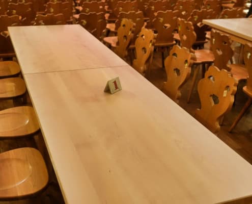 Reiner Pertl, Leiter dieses engagierten Teams, startete einen Aufruf, um fehlende Stühle zu ersetzen und hatte damit großen Erfolg. „Uns ist aufgefallen, dass einfach ein paar Stühle fehlten. Also habe ich herumgefragt und innerhalb kürzester Zeit hatten sich zwölf Leute gefunden, die neue Stühle finanziert haben“, erzählt Reiner Pertl. Unterstützung kam auch vom Schlierseer Trachtenverein mit Vorstand Toni Kölbl, der sich ebenfalls an der Aktion beteiligte. Die Namen der jeweiligen Sponsoren sind übrigens in die Stühle eingeschnitzt. Wenn du das nächste Mal im Schlierseer Bauerntheater zu Gast bist, lohnt sich also ein genauer Blick. Der Förderkreis des Schlierseer Bauerntheaters stieg ebenfalls in die Aktion mit ein und finanzierte neue Tischplatten. Florian Reinthaler, Vorstand des Schlierseer Bauerntheaters, zeigt sich dankbar: „Dass so viele an einem Strang ziehen, ist einfach großartig. Man spürt, dass das Bauerntheater nicht nur ein Gebäude ist, sondern ein Stück Heimat.“